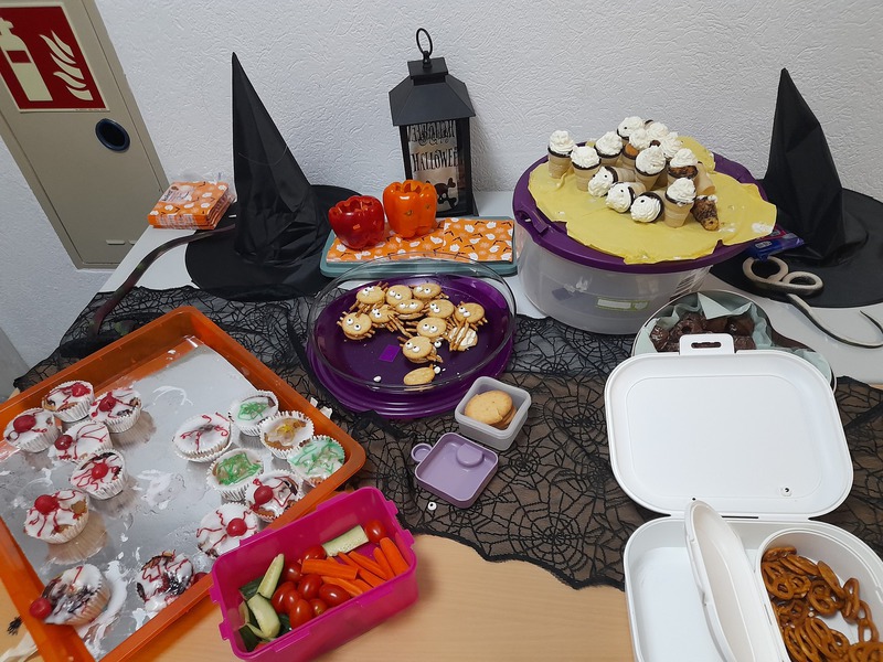 Also machten sich alle 29 Kinder abends mit „Sack und Pack“ auf den Weg in Richtung Schule. Voller Freude darüber, das gesamte Gelände für sich zu haben, spielten sie im Freien und fingen die letzten Sonnenstrahlen des Tages ein. Zur Stärkung wurde anschließend Pizza bestellt. Außerdem hatten einige Eltern noch ein kleines „Gruselbuffet“ mit „blutigen Würstchenfingern“, „gefüllten Keksspinnen“ und weiteren Leckereien in der schaurig schön dekorierten Aula vorbereitet.