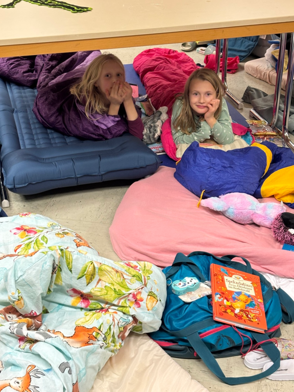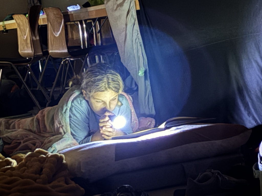Zurück in der Schule richteten sich die Kinder ihre Schlafplätze ein. Im Schein des Taschenlampenlichts lasen sie allein oder mit ihren Freundinnen und Freunden noch in ihren mitgebrachten Büchern, bevor alle müde in den Schlaf fielen. Ein aufregender Tag ging zu Ende.