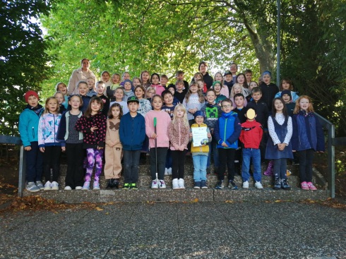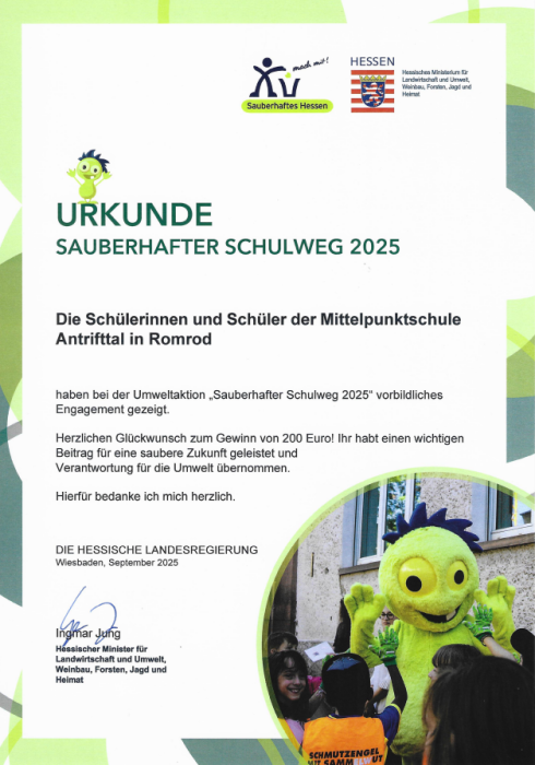 Bereits im vergangenen Schuljahr beteiligten sich die damaligen ersten und zweiten Klassen an der Aktion „Sauberhafter Schulweg“ im Rahmen der Umweltkampagne „Sauberhaftes Hessen“. Ziel dieser Aktion ist es, dass Schülerinnen und Schüler Müll auf dem Weg zur Schule bzw. in der Umgebung der Schule aufsammeln — sauber machen, Wege säubern, Abfall einsammeln. Damit soll Bewusstsein geschaffen werden für Umwelt-, Abfall‑ und Ressourcenschutz. Für dieses „vorbildliche Engagement“ wurden die Kinder der jetzigen zweiten und dritten Klassen nun durch die Hessische Landesregierung und den Hessischen Minister für Landwirtschaft und Umwelt, Weinbau, Forsten, Jagd und Heimat, Ingmar Jung, ausgezeichnet. Auf der Urkunde heißt es: „Ihr habt einen wichtigen Beitrag für eine saubere Zukunft geleistet und Verantwortung übernommen. Dafür bedanke ich mich herzlich.“ Die Klassen freuen sich zusätzlich zu einer sauberen Schulumgebung nun über einen Gewinn von 200 Euro.