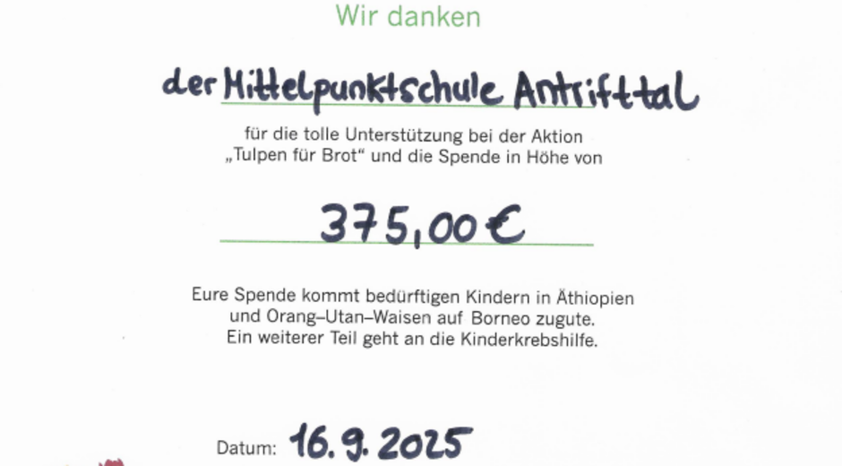 „Tulpen für Brot- Ein Aktion von Kindern für Kinder“ bedankte sich bei den Kindern und Lehrkräften für eine Spende in Höhe von 375,00 Euro. Auf Initiative der Kollegin Susanne Dietz nimmt die Schule seit vielen Jahren regelmäßig an der Aktion teil, bei der jeden Herbst Tulpenzwiebeln an die Schulgemeinde verkauft oder im Schulgarten angepflanzt werden. Die auf dem Schulgelände angepflanzten Tulpen werden zur Blütezeit ebenfalls als Schnittblumen zum Verkauf angeboten. Alle Einnahmen wurden gespendet. In diesem Jahr konnten so bedürftige Kinder in Äthiopien, Orang-Utan-Waisen auf Borneo und die Kinderkrebshilfe unterstützt werden.