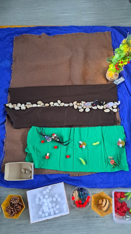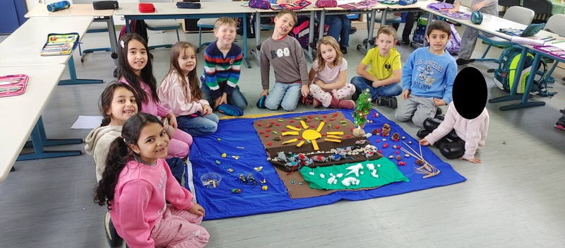 Nach einer kurzen Bewegungspause wurde die Geschichte im Sitzkreis Schritt für Schritt mit unterschiedlichsten Materialien gelegt und so bildlich nachempfunden. Die Kinder verwandelten den Erzähltext in ein lebendiges, kreatives Bodenbild.
