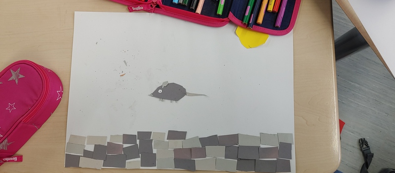 Im Anschluss folgte ein künstlerischer Teil in zwei Gruppen. Mit Frau Littig und Frau Schäfer bastelten die Kinder Stoffmäuse, während Frau Serikow mit der anderen Gruppe Collagen im Stil des Buches gestaltete.