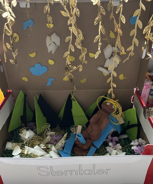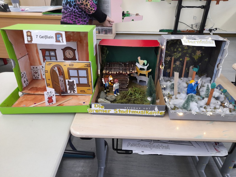 Anlässlich des diesjährigen Vorlesetages gestalteten unsere dritten Klassen, passend zum aktuellen inhaltlichen Schwerpunkt im Fach Deutsch, Märchen in Schuhkartons. Selbstgewählte Märchenszenen wurden dabei mit viel Liebe zum Detail dargestellt. Dafür hatten sich die Schülerinnen und Schüler im Vorfeld bereits intensiv mit ihren Märchen auseinandergesetzt und Materialien für die Umsetzung ihrer Ideen gesammelt.