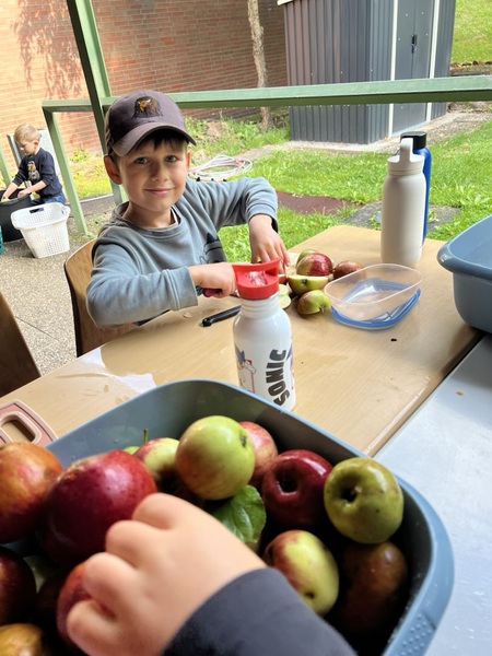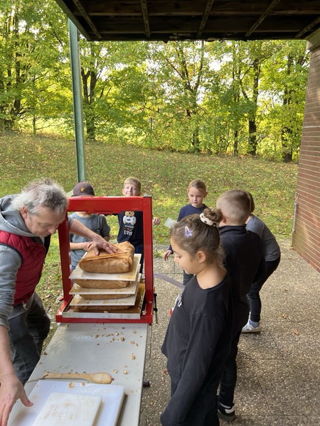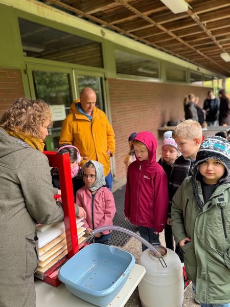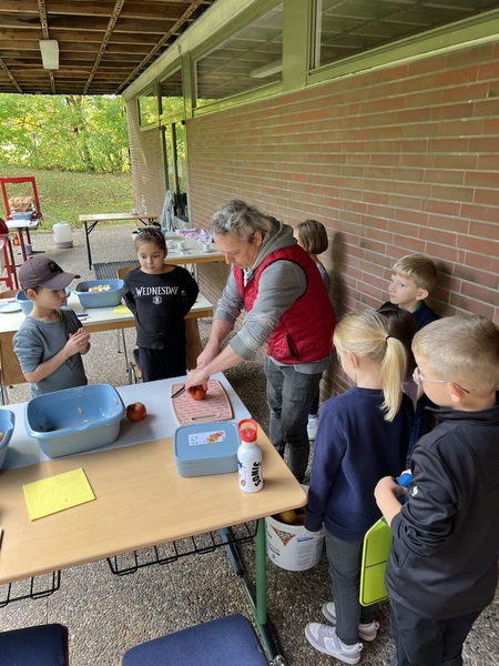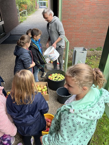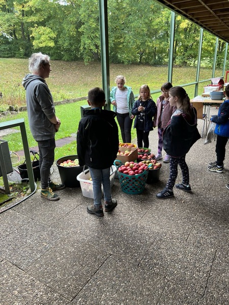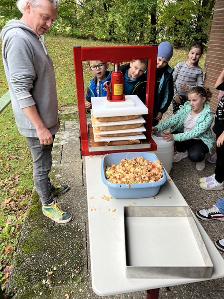 Das lernten die beiden 2. Klassen am 30. September und am 1. Oktober, denn anstelle des normalen Unterrichts stand das traditionelle Apfelsaftpressen mit dem AZN auf dem Stundeplan. Trotz kühler Temperaturen verlief alles reibungslos. Im Klassenraum erfuhren sie, wie sich der Apfel von der Blüte bis zur Frucht entwickelt. Da die Apfelernte in diesem Jahr reichlich war, brachten die Kinder viele selbst geerntete Äpfel von zuhause mit: teils ganze Wannen voll.