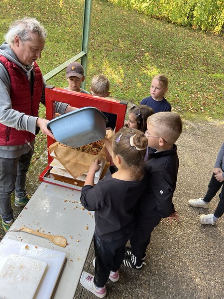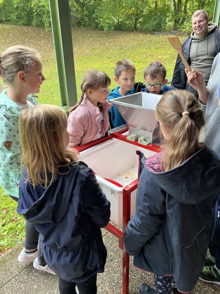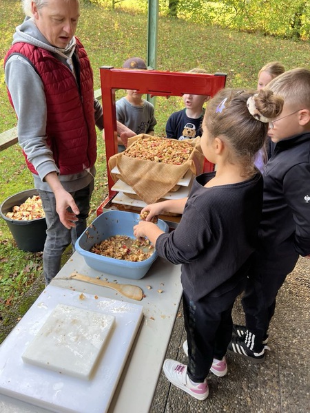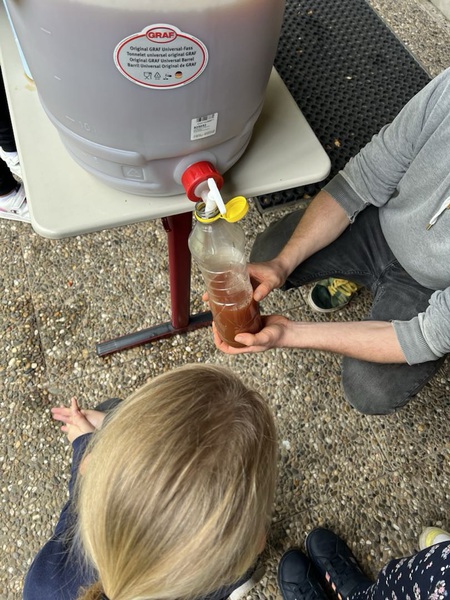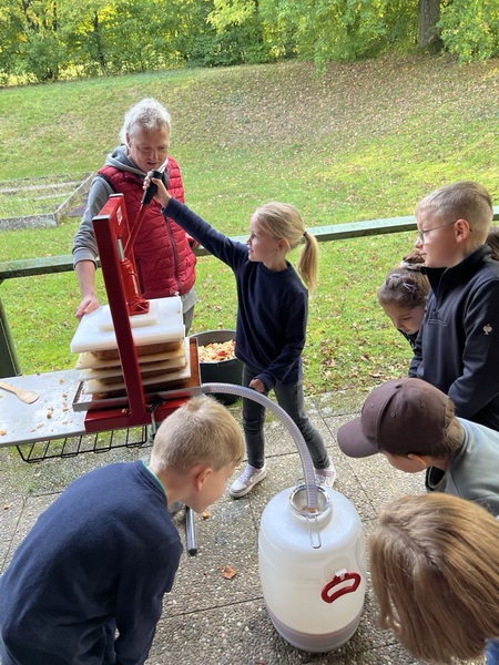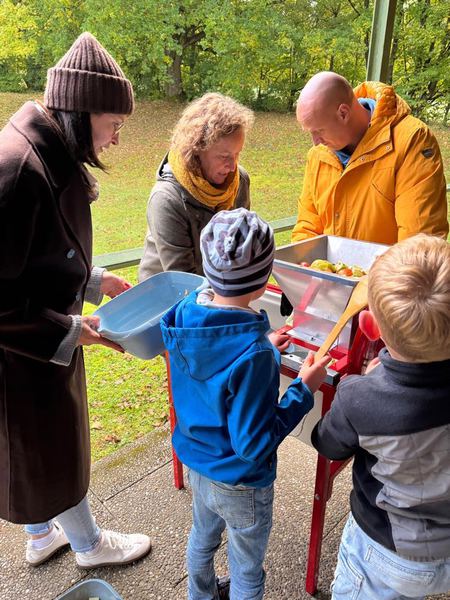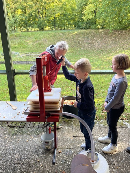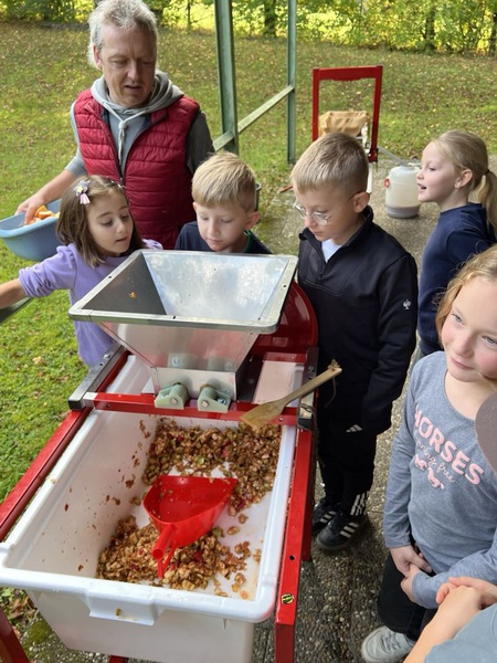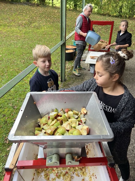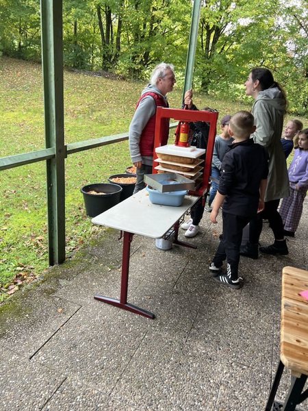 Im praktischen Teil wuschen, zerkleinerten und pressten die Kinder diese Äpfel mit viel Engagement. Unterstützt wurden sie dabei von den Mitarbeitenden des AZN, mehreren Eltern sowie den beiden Klassenlehrerinnen Emely Scherer und Isabel Baum. Der frische, aromatische Apfelsaft war die wohlverdiente Belohnung für die gemeinsame Arbeit und rundete den gelungenen Tag perfekt ab.